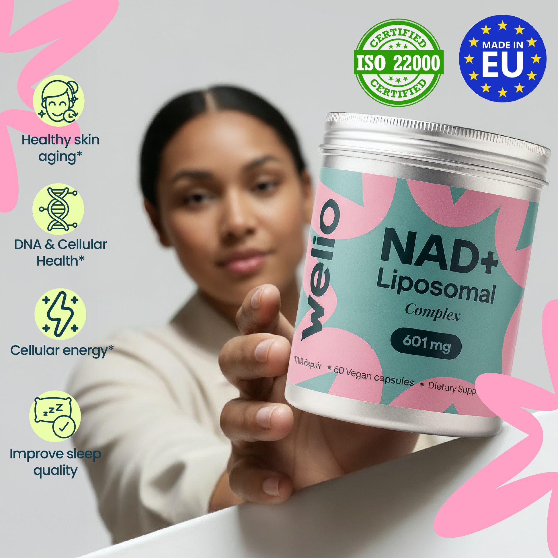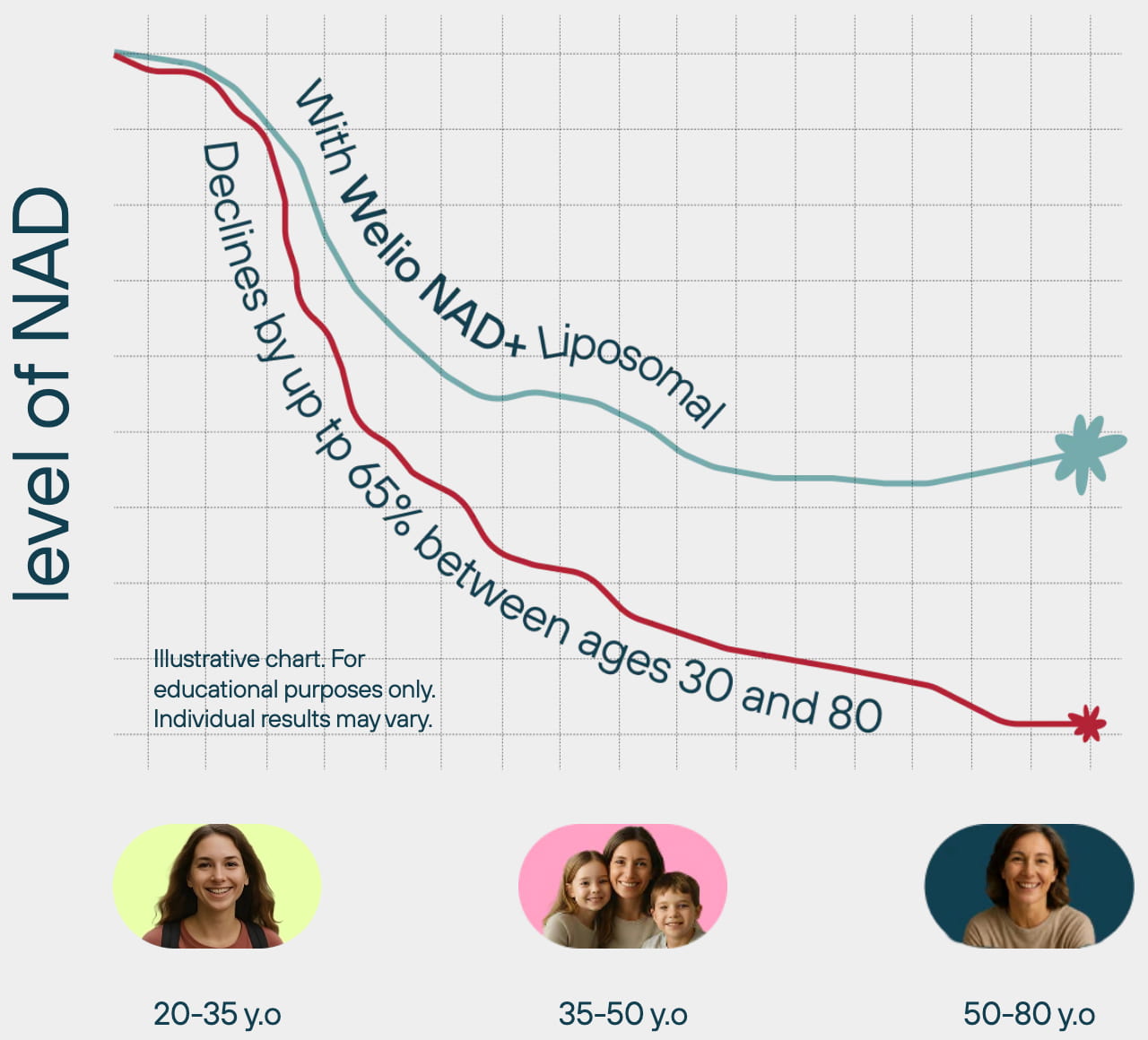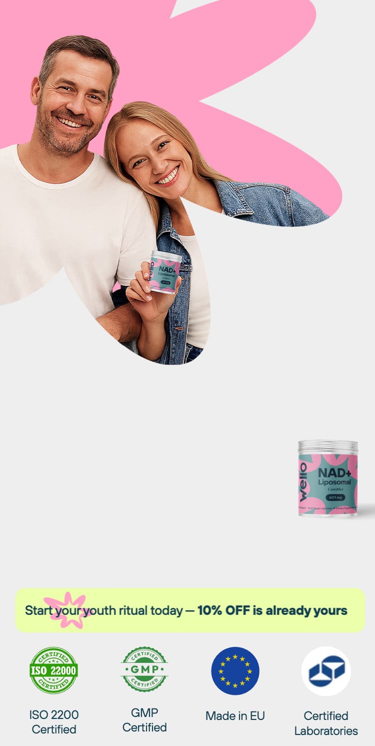 From your 30s, NAD+ levels naturally fall — and so do energy, clarity, and recovery. Welio helps support your healthy NAD+ levels with advanced liposomal delivery.*